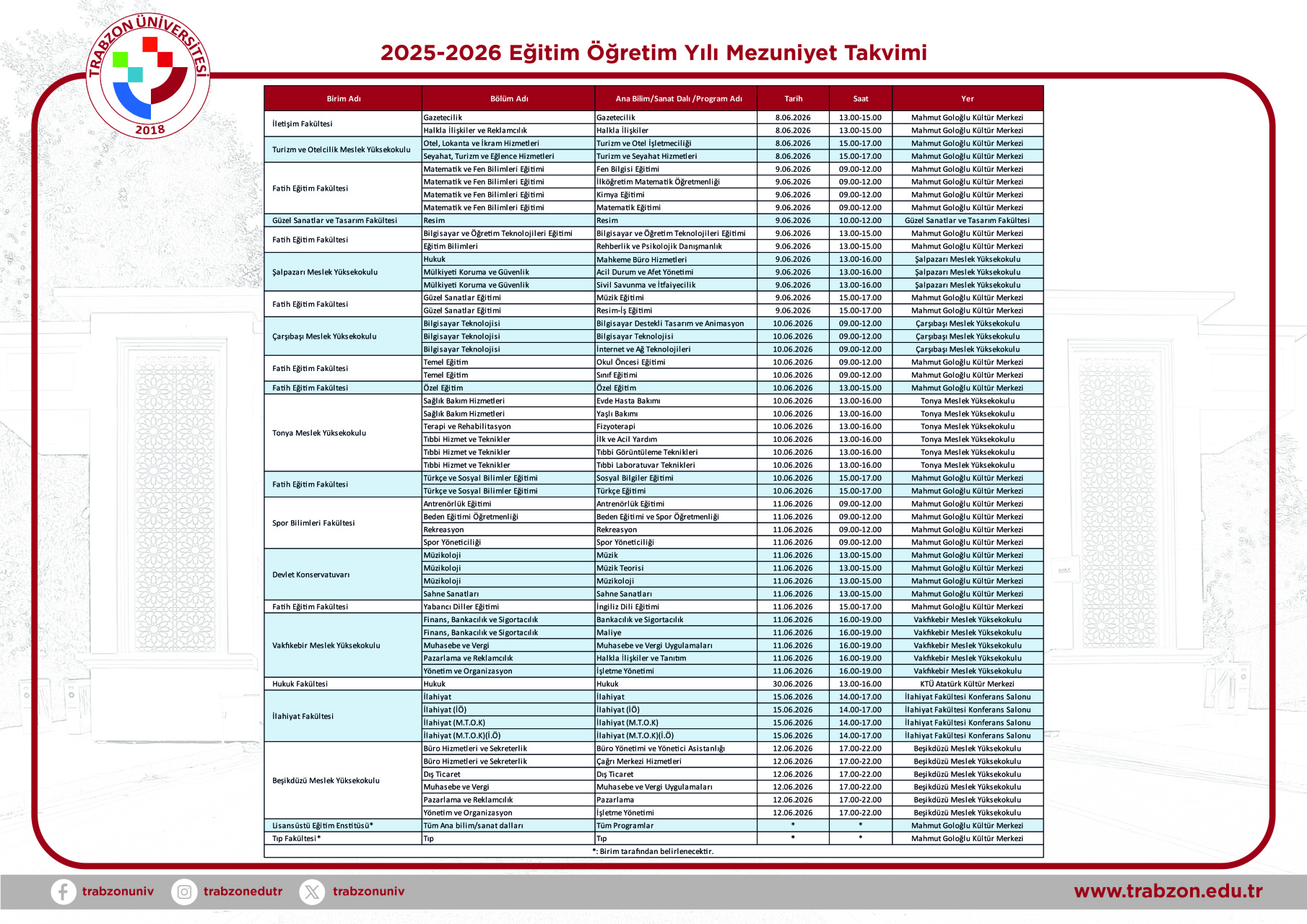 Mezuniyet törenine ilişkin detaylı bilgilere aşağıdaki tablodan ulaşabilirsiniz.
