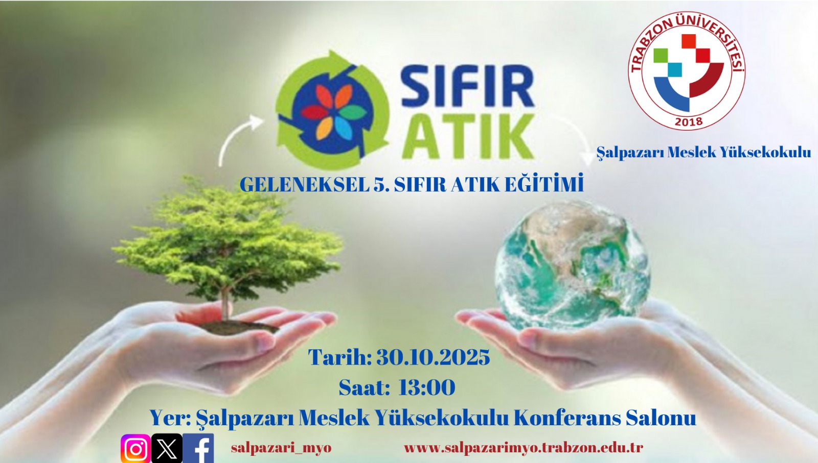 Şalpazarı Meslek Yüksekokulumuz öğrencilerine yönelik "GELENEKSEL 5'İNCİ SIFIR ATIK EĞİTİMİ" düzenlenecektir. Tüm Öğrencilerimiz davetlidir.
