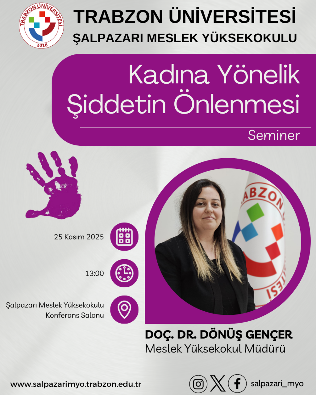 Toplumsal farkındalığın artırılmasına katkı sağlamak amacıyla “Kadına Yönelik Şiddetin Önlenmesi” konulu bir seminer düzenlenecektir. Doç. Dr. Dönüş GENÇER tarafından gerçekleştirilecek seminerde; kadına yönelik şiddetin toplumsal boyutları, şiddet türleri, hukuki süreçler ile korunma ve başvuru mekanizmaları kapsamlı biçimde ele alınacaktır.