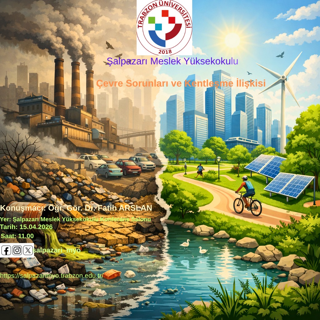 15 Nisan 2026 Çarşamba  günü Saat 11:00'da  Meslek Yüksekokulumuz akademisyenlerinden Öğr. Gör. Dr. Fatih ARSLAN tarafından Şalpazarı Meslek Yüksekokulu Konferans Salonu’nda “Çevre Sorunları ve Kentleşme İlişkisi ” etkinliği yapılacaktır. Tüm öğrencilerimiz davetlidir.