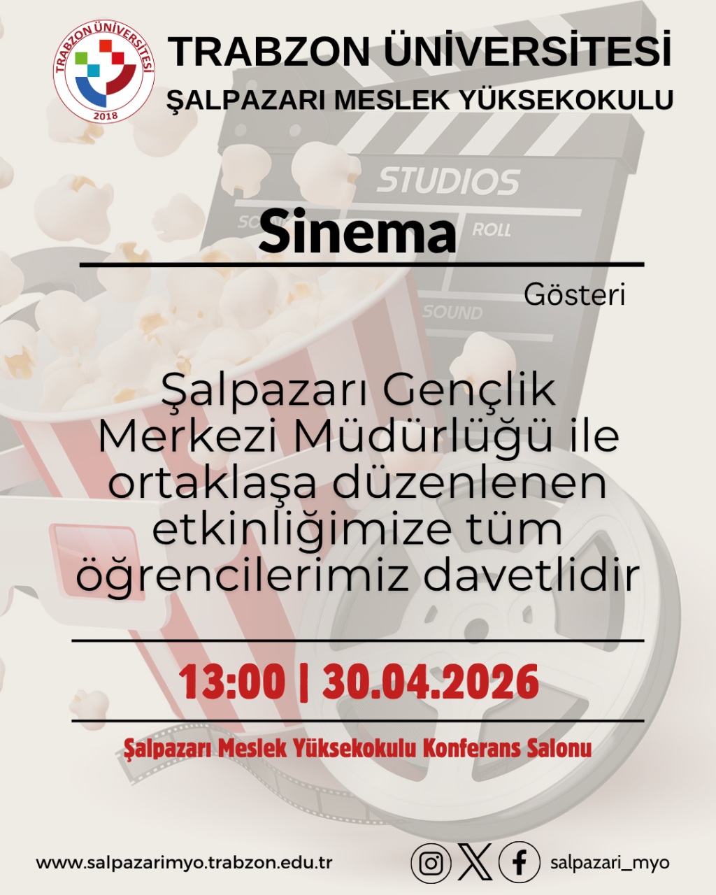 Meslek Yüksekokulumuz ve Şalpazarı Gençlik Merkezi Müdürlüğü iş birliğiyle düzenlenen film izleme etkinliğimize tüm öğrencilerimiz davetlidir.